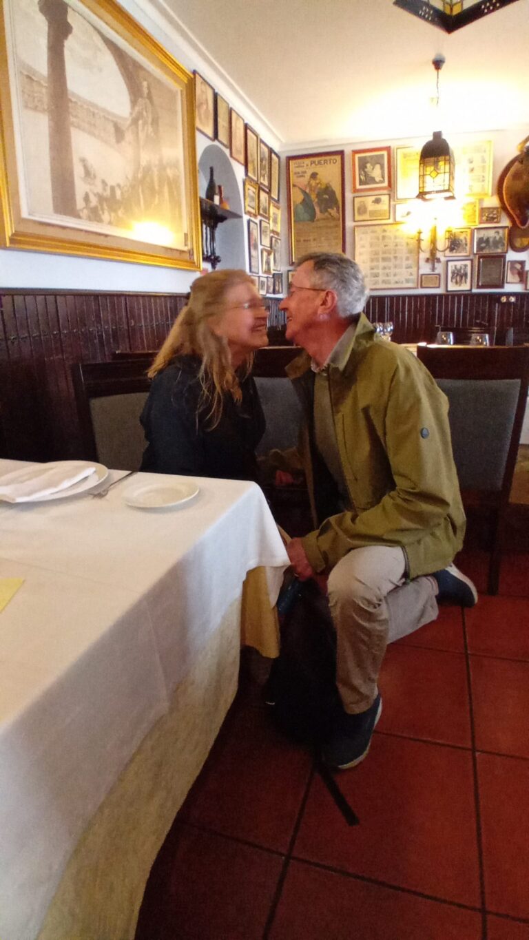 Onze volgende stop deze dag is Ronda. Het plan was om eerst de stierenvechtersarena te bezoeken, maar een telefoontje vanuit het restaurant maakte ons duidelijk dat we in het restaurant werden verwacht, omdat een volgende groep na ons ook het restaurant nodig had. Daar zaten we weer, samen aan tafel voor een heerlijk driegangenmenu. Ik denk dat velen na deze reis zullen moeten afkicken en afvallen. Wat ook heel bijzonder was, dat het restaurant waar we de lunch hadden, hetzelfde restaurant was waar Theo, Lianne 15 jaar geleden ten huwelijk vroeg. Dat moest dus even herdacht en nagespeeld worden.