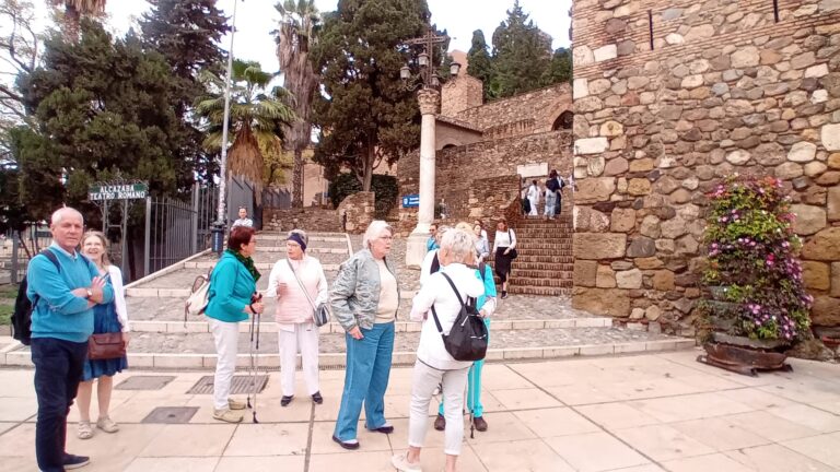 Daarna werd iedereen verwacht weer aanwezig te zijn bij het Romeinse theater. Dat lukte wonderwel. Iedereen was aanwezig om een wandeling te maken naar de stopplaats van de bus. De bus zou ons nog naar een prachtig uitijkpunt brengen boven op een heuvel vlakbij de ruïnes van het Castillo de Gibralfaro. Een prachtig uitzicht op de haven, de stierenvechtersarena en de binnenstad van Malaga.