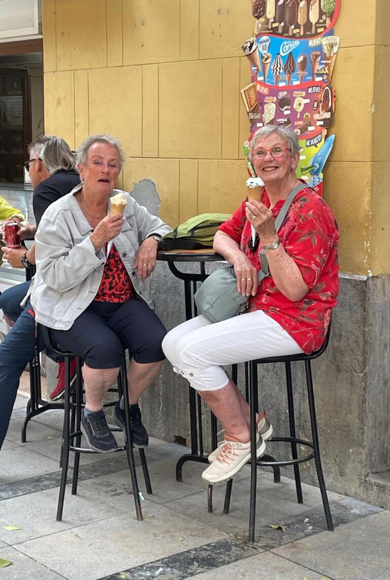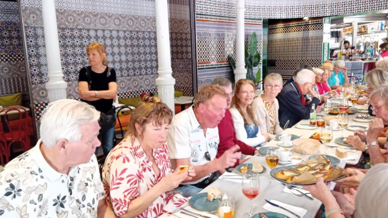 Na de viering meldden we ons bij het restaurant in het centrum van Malaga. De stad was al behoorlijk volgelopen en de terrassen zaten allemaal vol. Wij werden verwend met een heerlijk tapasmenu. Wel zaten we erg benauwd aan lange tafels, maar de sfeer was uitstekend. Sommigen van ons hebben het laatste gedeelte van het tapasmenu niet meegemaakt, omdat zij online kaartjes hadden besteld voor een bezoek aan het Picassomuseum om 14.00 uur. Ee museum dat echt de moeite waard was, hoorden we later van de museumbezoekers. Na de lunch was er tot 15.30 uur tijd om vrij te besteden.